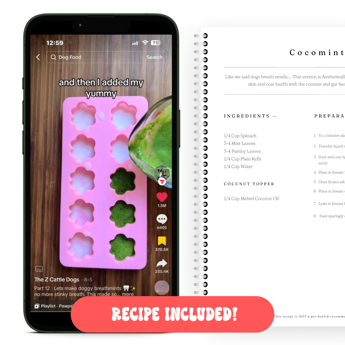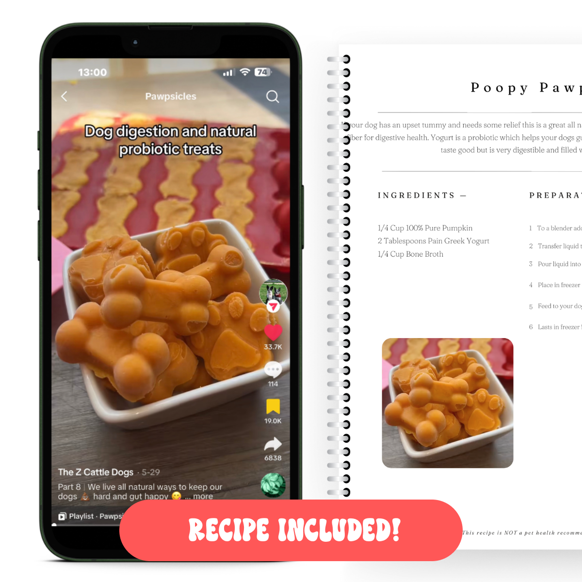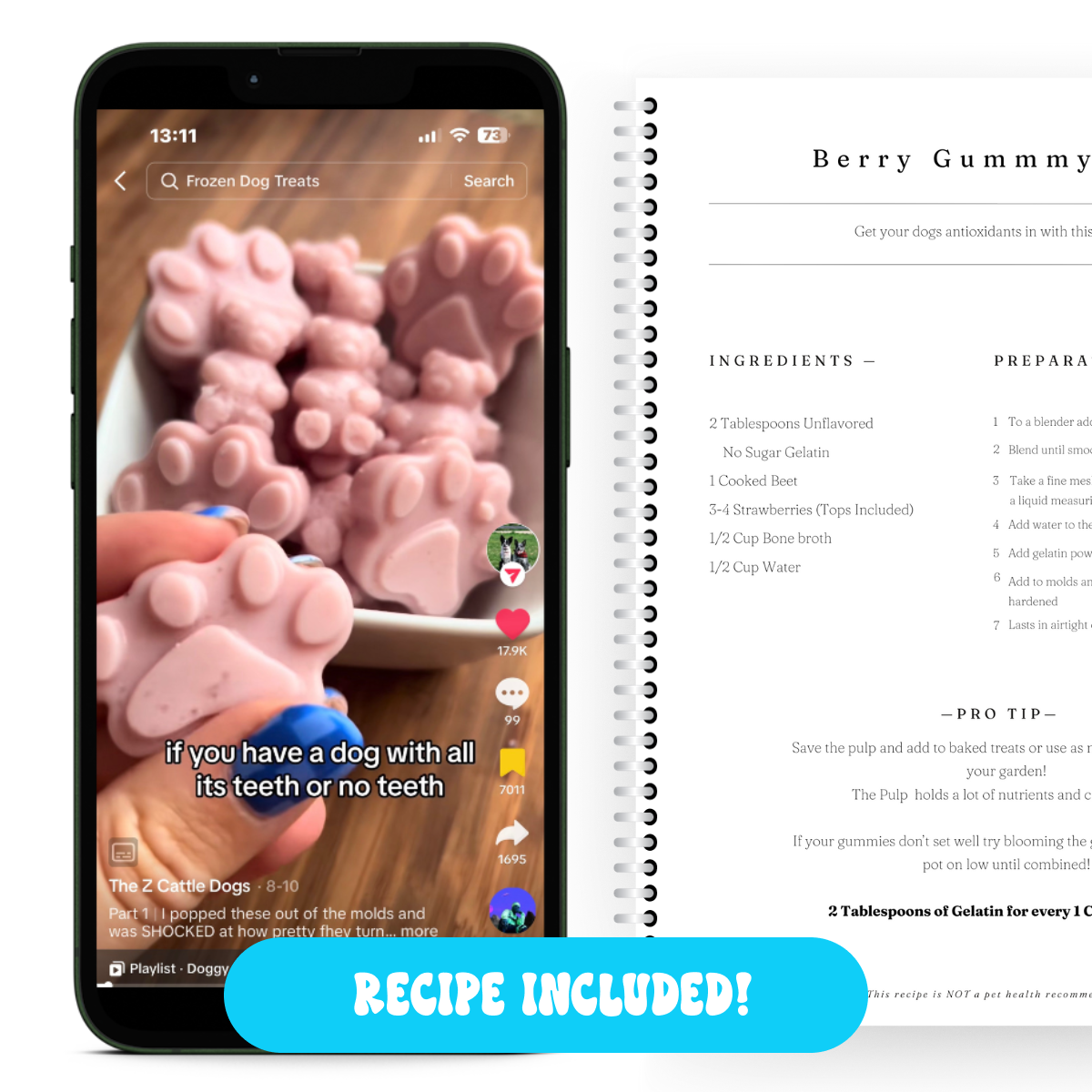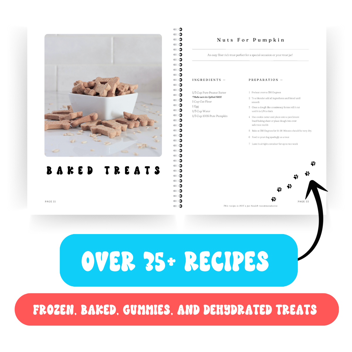 The DIY Pet Treats Recipe Book Includes Over 35+ different recipes you can follow to make yummy treats at home for your pets. Keep this recipe book in the kitchen or somewhere easily accessible for whenever you and your pet feels like their food is getting boring. With over 35 different recipes there is a treat for pets. Supplementing your pets' boring plain and regular kibble is a big benefit for your pets. We love to add multiple treats and boosters to our dogs meals every day!! Just watch our TikToks.